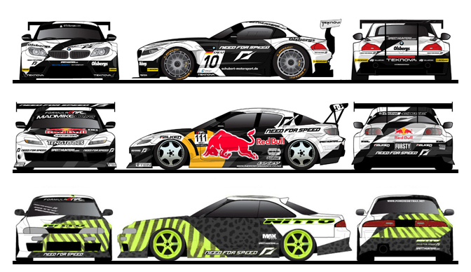 I started sketching some ideas for the Team Need for Speed livery on the last day of 2009. Rod and Patrick had introduced me to the Team Need for Speed concept and it was my task to create a livery which would work in multiple arenas. Not an easy task, on one hand it was a great opportunity, but the on other hand it was ‘how the hell am I going to pull that off!’