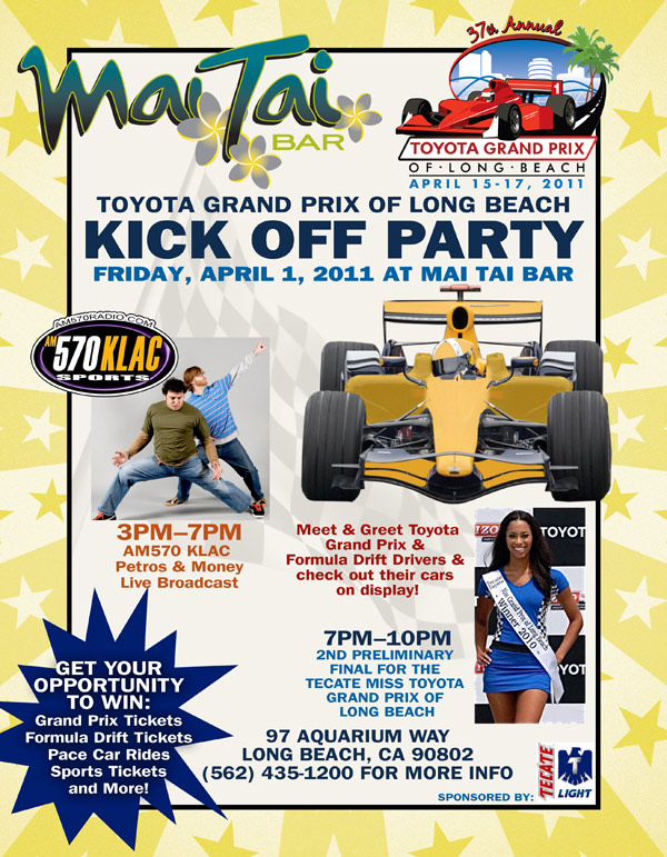 Join Formula Drift drivers at Mai Tai Bar in Downtown Long Beach tomorrow – April 1. Starting at 3PM the “Petros & Money” Sports Radio show will be broadcasting live and conducting interviews with the drivers. A few FD cars will also be on display and free giveways throughout the day.