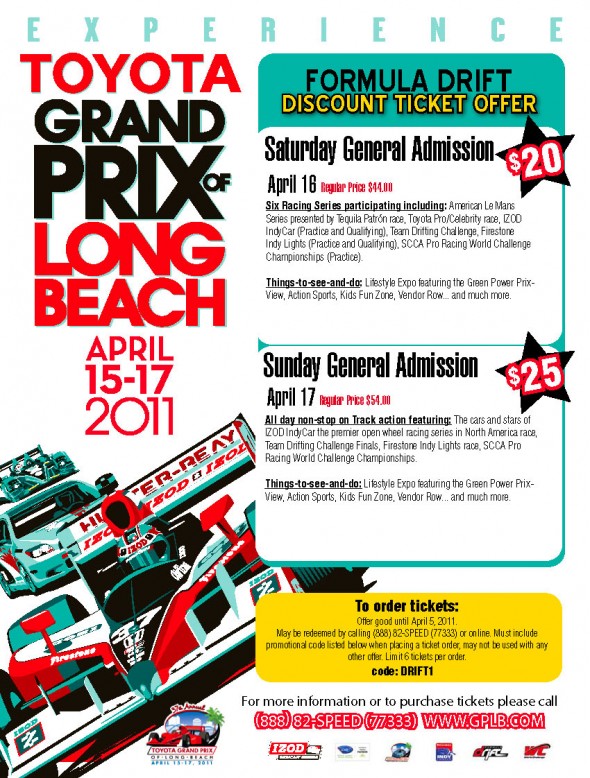 Long Beach Grand Prix – Formula D Discount Ticket Offer News Posted on March 28, 2011 by FormulaD To order tickets: Offer good until April 5, 2011. May be redeemed by calling (888)82-SPEED (77333) or online. Must include promotional code listed below when placing a ticket order, may not be used with any other offer. Limit 6 tickets per order. Code: DRIFT1