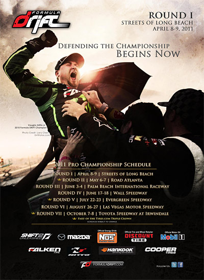 The Formula DRIFT season begins on April 8-9, 2011 with Round 1: Streets of Long Beach in Downtown Long Beach, CA. Tickets will be available for purchase online through the Formula DRIFT website. A new website will be launched in the coming weeks. For information on when tickets go on-sale visit: www.formuladrift.com
