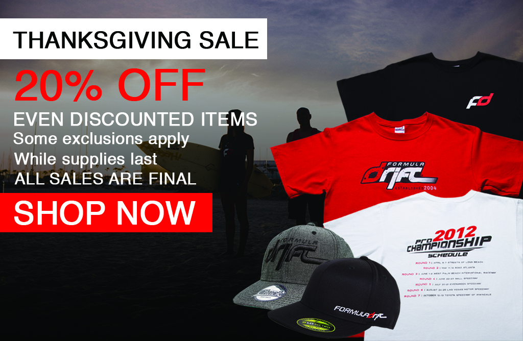 Here it is, if you haven’t gotten the chance to pick up any Formula DRIFT Official Merchandise this year, now is the time. Thanksgiving Sale is now live, and we will be running it till next week friday! Go visit shopfd.com