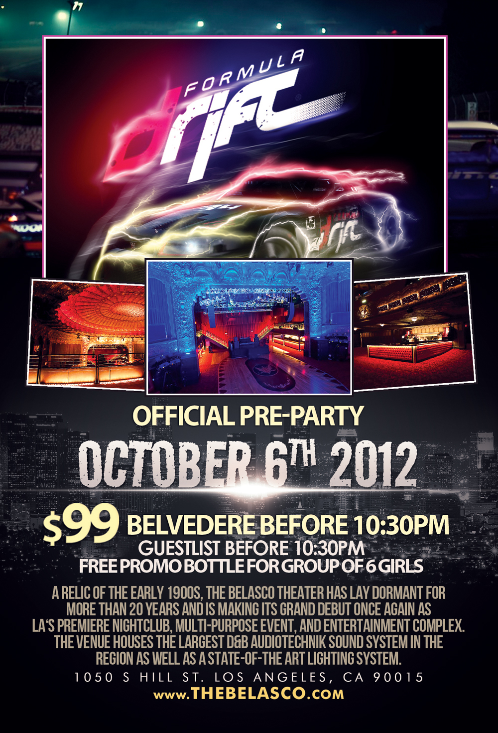 Formula DRIFT Round 7 – Irwindale Official Kick Off Pre Party News Posted on October 2, 2012 by FormulaD What: Formula DRIFT Round 7 Official Kick Off Pre-Party at The Belasco When: Saturday, October 6, 2012 10:30 PM – Till Close Where: The Belasco 1050 S Hill Street Los Angeles CA, 90015 Info: 21+Over w/valid I.D.