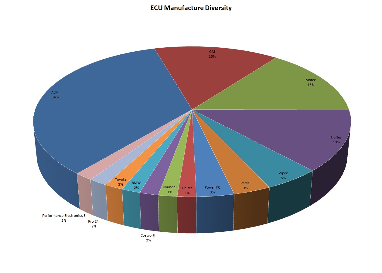 There is also a variety of ECU Manufacturers involved with AEM represented in 34% of the vehicles in the Series followed by GM and Motec with 15% each and Holley with 13%.