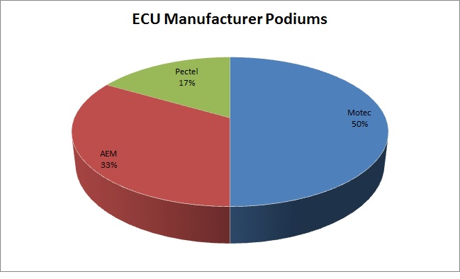 Interestingly, enough only three ECU manufacturers have found the podium this season with Motec having 50% of the podium finishes, AEM with 33% and Pectel with 17%.
