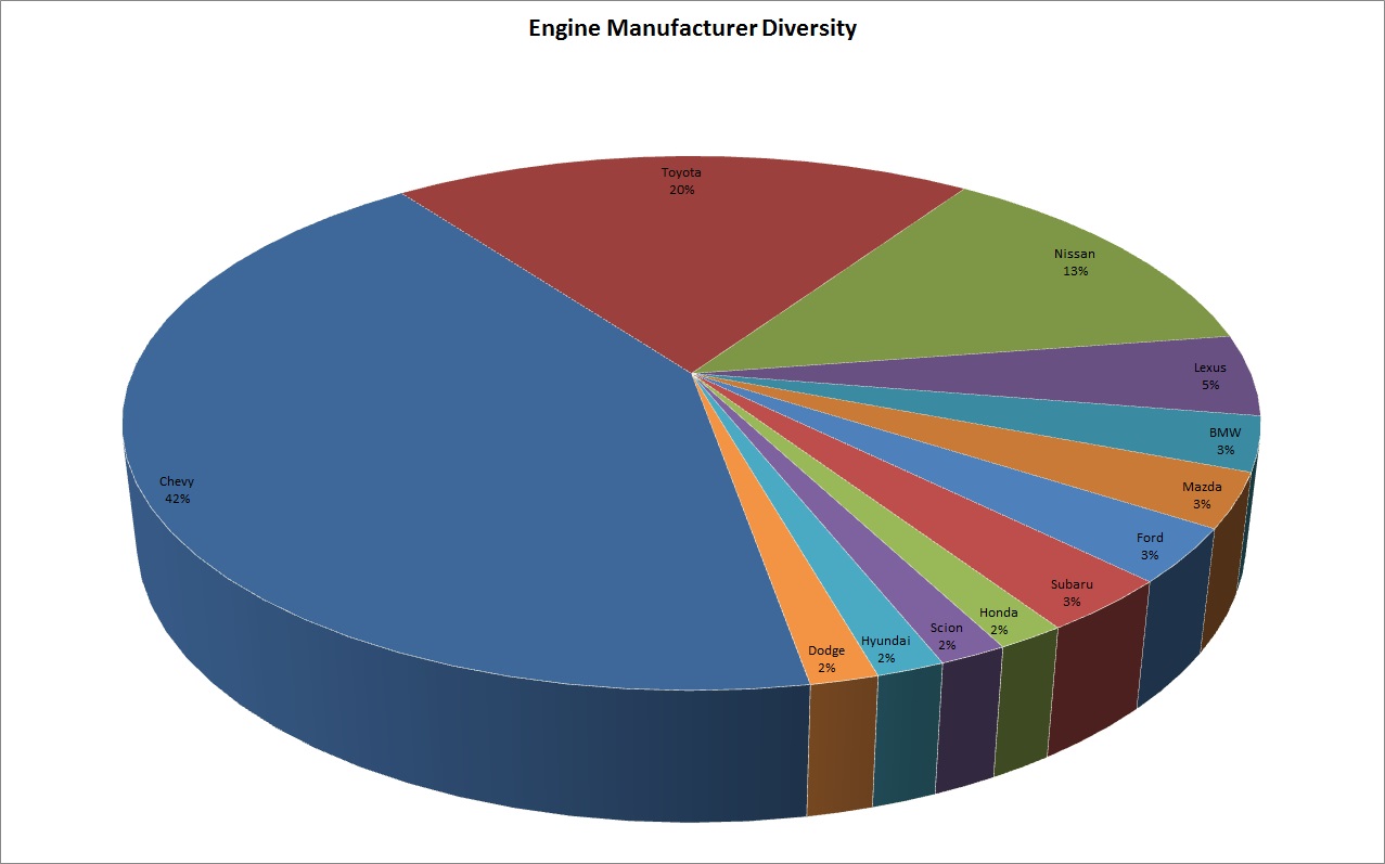 In 2013, we have seen a total of 61 different vehicles compete in the Pro Championship Series. 42% are running Chevy engines, while Toyota engines are represented in 20% of the field and Nissan in only 13%.