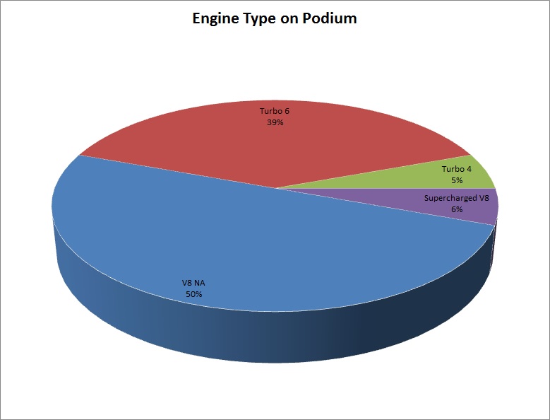 Breaking this down even further we found the following engine types on the podium. Naturally aspirated V8’s have lead the way with 50%, 39% have a Turbo V6, 6% with a Supercharged V8 and only 5% with a Turbo 4 cylinder.