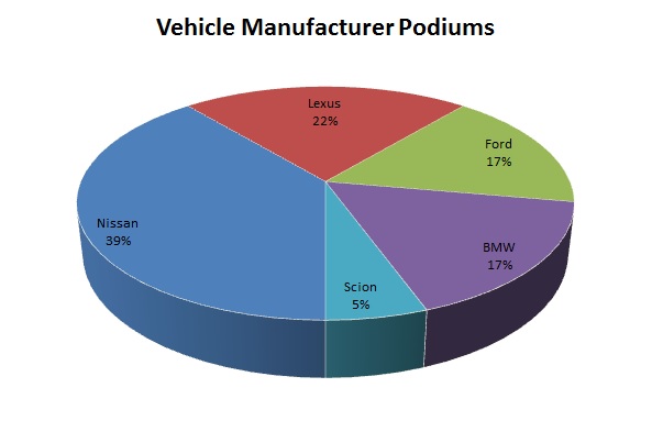 However, the diversity of various engine manufacturers to see the podium with 18 podium spots through six rounds is more competitive with 22% for Nissan and Lexus, 17% for Ford, BMW and Chevy and the remaining 5% for Scion.