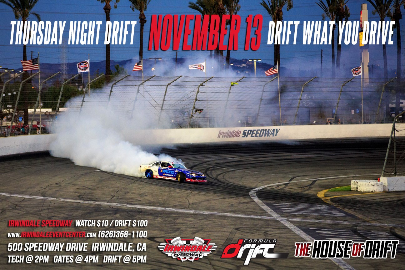 Irwindale Thursday Night Drift will be held on Thursday November 13, 2014 will be open to the general public. Admission to the track’s grandstands will start at $10.00 including free parking.