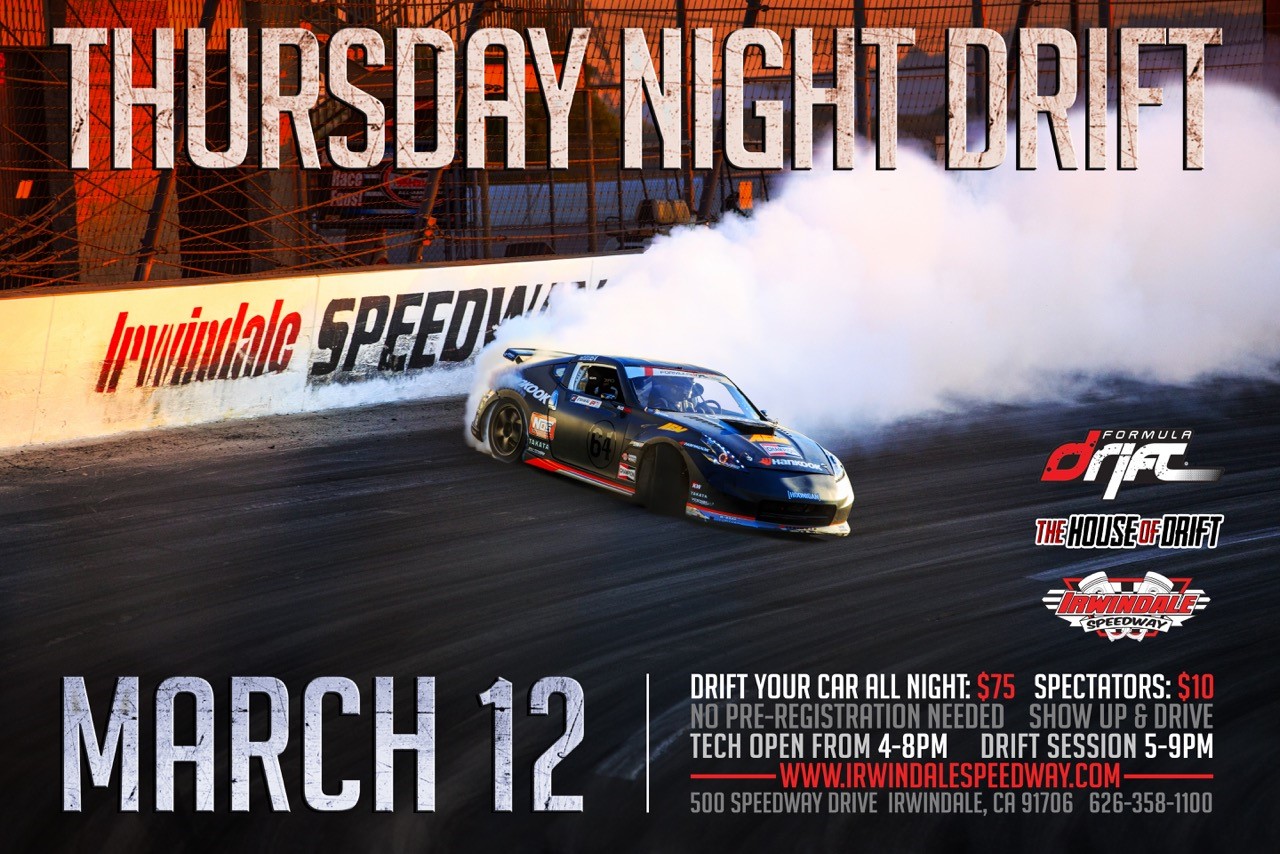 Irwindale, Calif. – – They’re back, they’re smokin’ sideways, and they’re wilder than ever! Beginning Thursday night March 12, Irwindale’s own Formula DRIFT open practice sessions will resume on the course that the entire civilized world now knows as the legendary “House of Drift” … aka: Irwindale Speedway right at the top of the 605 freeway.