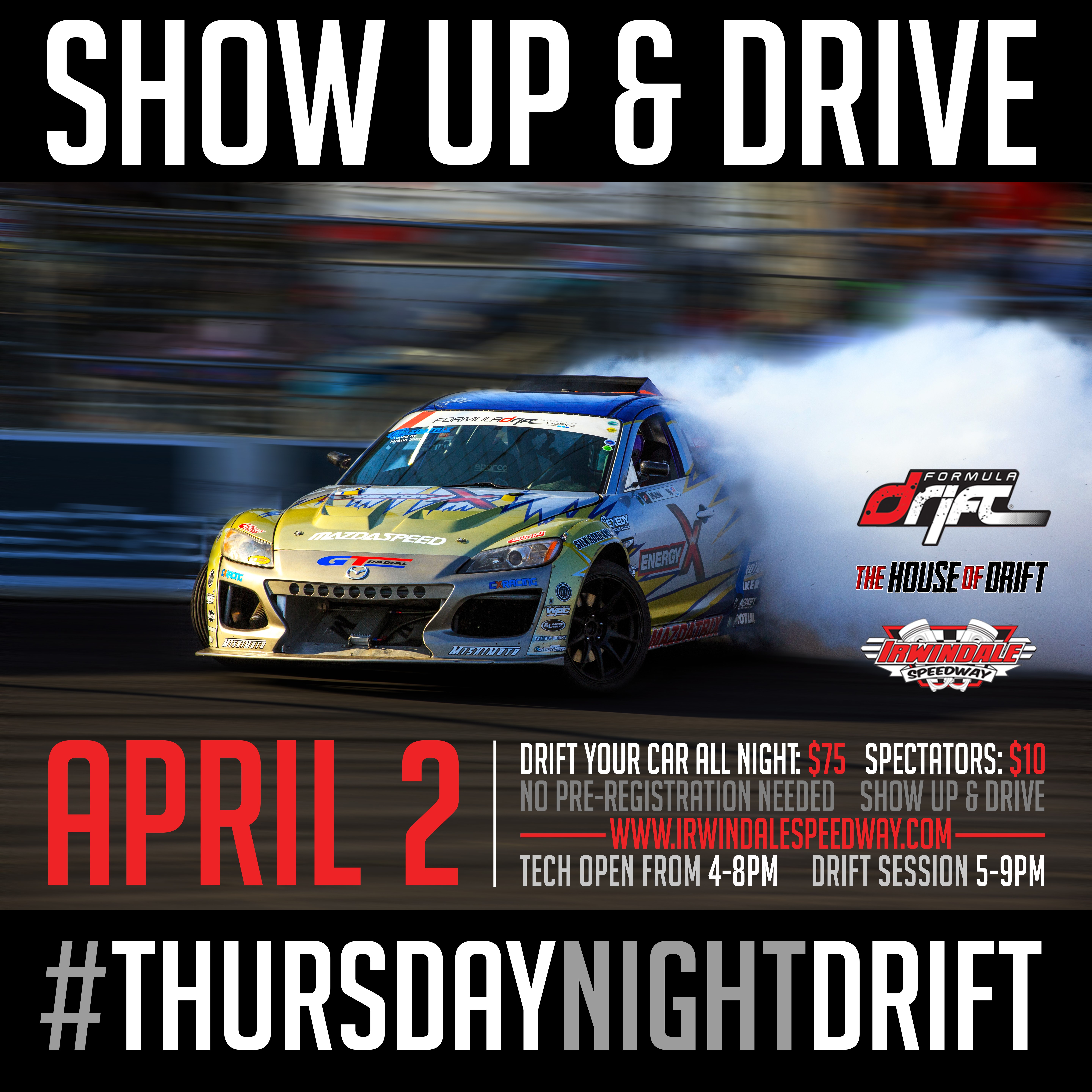 Each of the Thursday night sessions will start with a (public invited) technical inspection for the competition vehicles at 4PM and drift practice will run flat out from 5 to 8PM. The fan gates open at 4PM and there’s plenty of close-free parking.