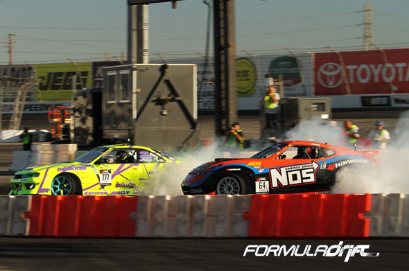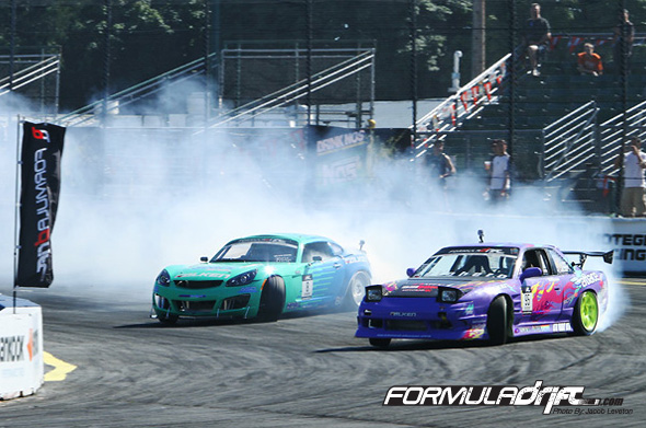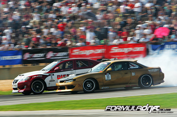 In 2009, the first year in which Formula D expanded to top-32 tandem format, we caught an early glimpse of how awesome the tandem battles can be in the round of 32. Mike Essa had a great battle with Tyler McQuarrie, unfortunately not having enough to move past the Falken Tire 350Z. But the most exciting tandem battle came between 2nd qualifier Dai Yoshihara and 31st qualifier Pat Mordaunt. Pat put on four stellar runs, two in the original battle and two more in the one-more-time battle, to knock out Yoshihara’s Discount Tire IS350. Entering this year’s event, it seemed that it wasn’t a matter of if there would be first round upsets but who they would be.