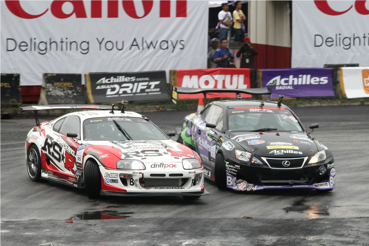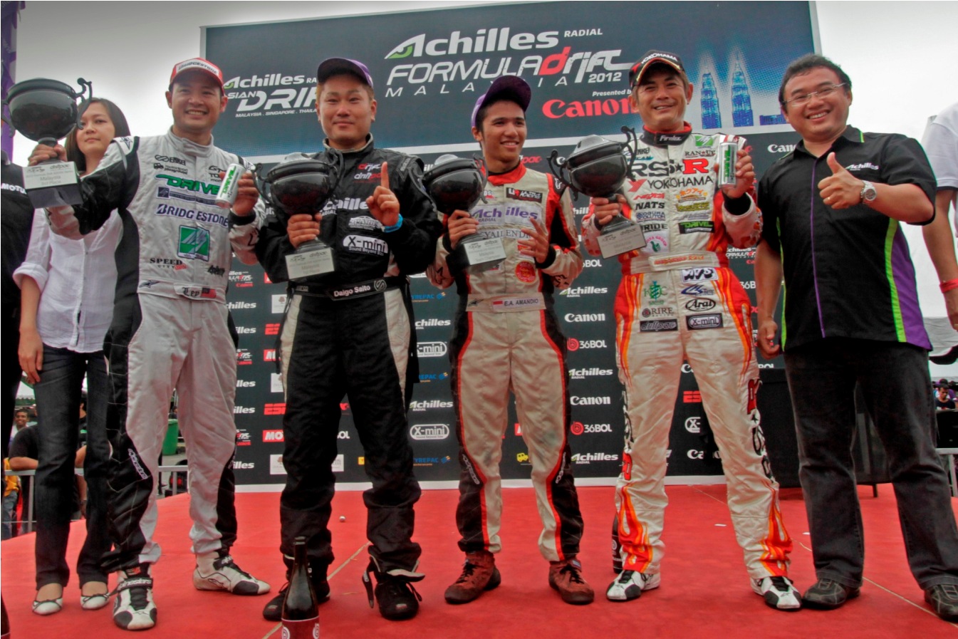 20 May 2012 (KUALA LUMPUR): Daigo ‘The Ninja’ Saito of Achilles Drift Team triumphantly beat drift legend Manabu ‘Max’ Orido for the second consecutive year to be crowned champion of Achilles Formula Drift Malaysia 2012, presented by Canon, while Malaysia’ Tengku Djan Ley of M7Bridgestone rounded up the podium in his comeback race in third place.