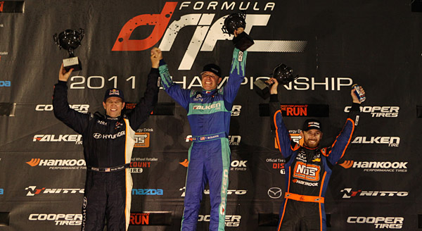 The results of the event could only be described as the ultimate finish to crown a champion. This event was the closest and most competitive chase for the championship in Formula DRIFT history, with 5 drivers entering with a chance at the title. Rookie of the year honors went to Aurimas “Odi” Bakchis. Many scenarios played out with such a close gap in the point standings. Daijiro Yoshihara entered with the point lead and was taken out early in the Top 16 opening the door for the others to take the championship. Yet, the stars were aligned for Yoshihara and by a narrow margin he was able to hold onto the lead to win the 2011 Formula DRIFT Championship along with the Tires.com Triple Crown. Marking the first time in Series history that the champion also wins the bonus prize.