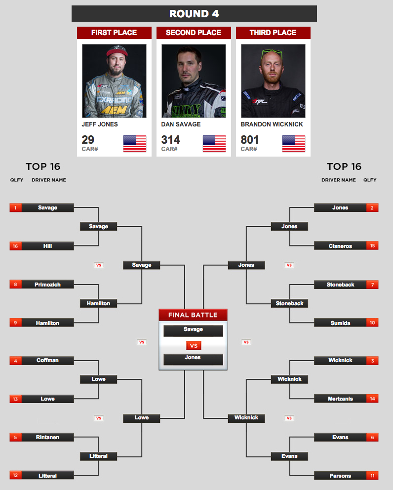 The finals pitted Jeff Jones against Dan Savage. Savage on his chase run crashed giving Jones his first ever competition victory. Brandon Wicknick in the Driftmotion D-Spare Nissan 2JZ S13 rounded out the podium in third place.