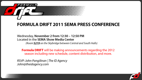 For those attending the annual SEMA tradeshow next week in Las Vegas, Formula DRIFT will hold a press conference to announce news items pertaining to the Series.