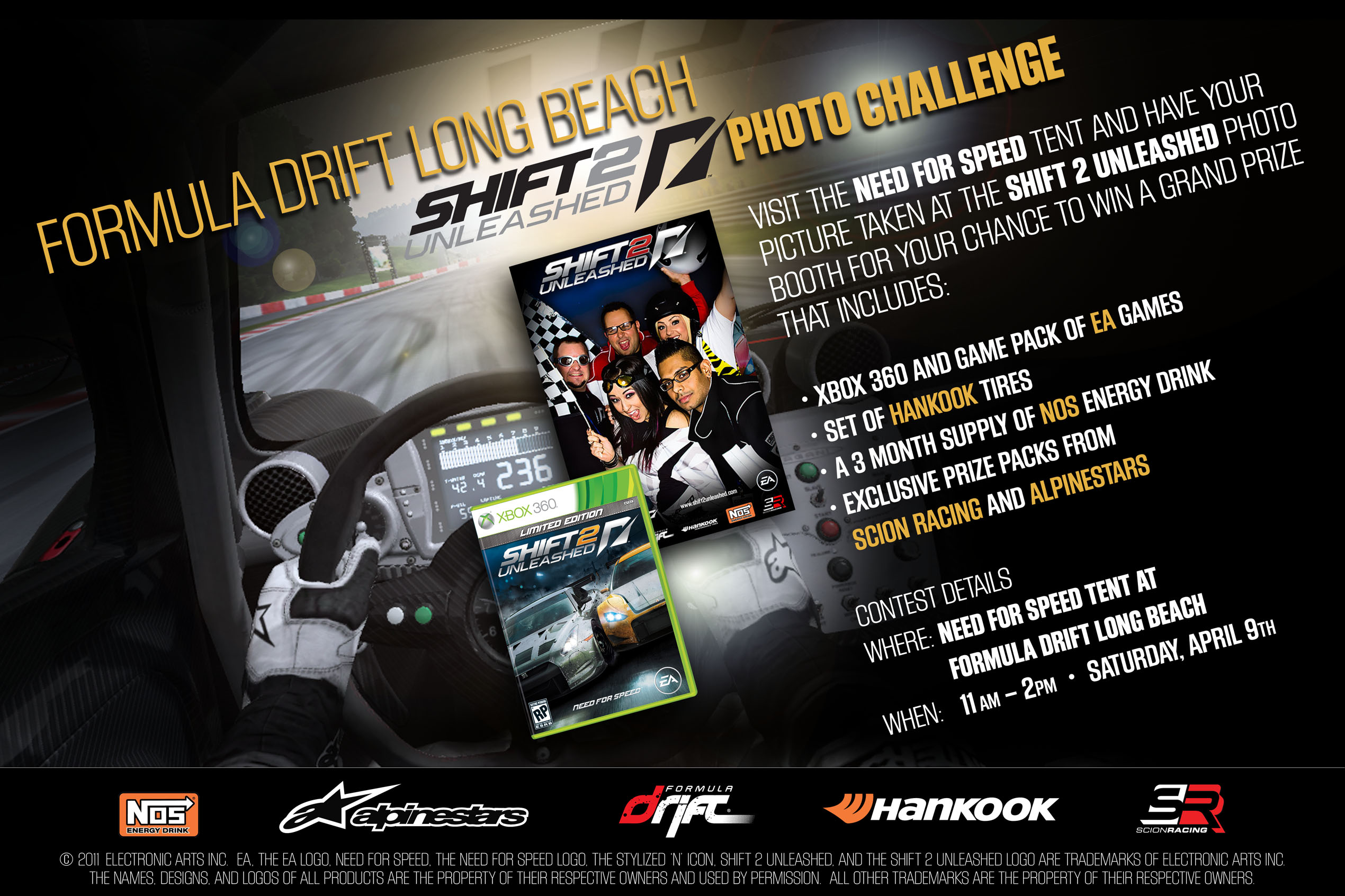 Take part in the Shift 2: Unleashed Photo Challenge at Formula Drift Long Beach this Saturday, April 9th. Visit the Shift 2: Unleashed photo booth at the Need for Speed tent for your chance to win a grand prize of an XBOX360 and 5 EA games, a set of Hankook tires, exclusive prize packages from Alpinestars and Scion Racing and a 3-month supply of NOS energy drink. Challenge runs from 10 am – 2 pm on Saturday, with grand prize winner announced at the Need for Speed booth at 2 pm.
