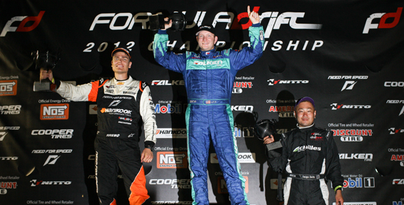 Justin Pawlak takes his second consecutive victory to increase his points lead. Additionally, Pawlak is now the points leader in the Tires.com Triple Crown bonus prize. Pawlak faced Fredric Aasbo in the Need for Speed / Hankook Scion TC and edged out the 2010 Rookie of the Year to take the victory. Walker Wilkerson in the Falken / Fatlace / Garage Autohero Nissan 240SX battled Formula DRIFT rookie, Daigo Saito in the Achilles Tire / Bridges Racing Lexus SC430 in the consolation round. After a one more time battle Saito beat out Wilkerson to take his second third place finish of the season.