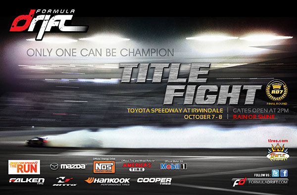 The Toyota Speedway at Irwindale hosted the finale event to a sold out crowd. The action was non-stop all weekend featuring the Formula DRIFT ProAM championship, Fatlace One of One Showcase car show, and the Formula DRIFT championship. In addition this was the first drifting event to be filmed in 3D by DirecTV with an air-date to be announced. The event was also featured live online via the DriftStream to a global audience.